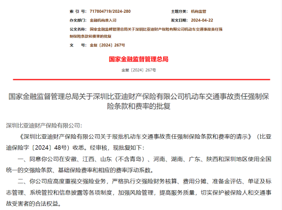 经过一年的布局,比亚迪保险终于于今年5月拿到车险“准生证”。2024年5月6日,国家金融监督管理总局发布公告称,同意比亚迪保险在安徽、江西、山东(不含青岛)、河南、湖南、广东、陕西和深圳地区使用全国统一的交强险条款、基础保险费率和相应的费率浮动系数。这也是继去年11月比亚迪财险车险业务范围被批准后,其车险业务再次获得实质性进展。